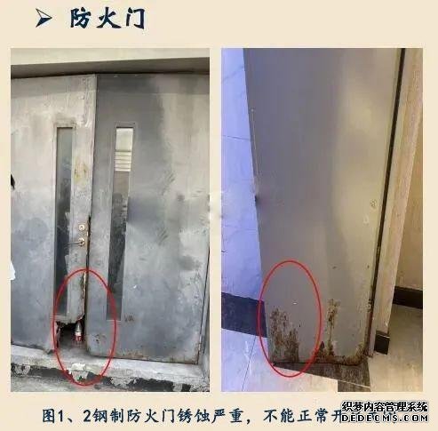 3、常见问题 防火门闭门器损坏、双扇防火门未安装顺序器,楼梯间的防火门不能保证常闭。